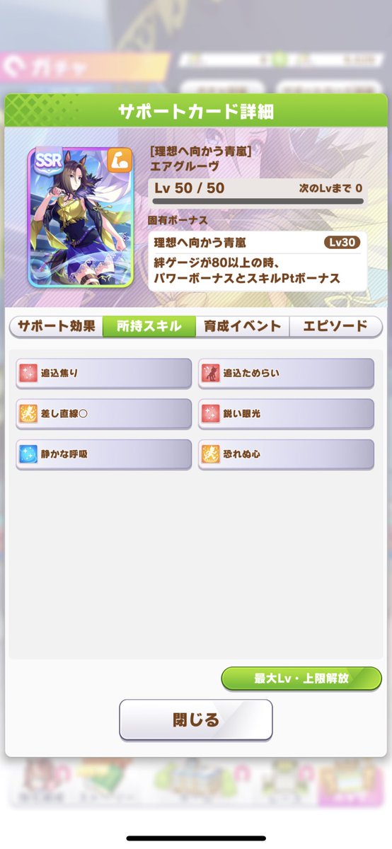 デバフ型エアグルーヴ育成 エアグルーヴ特徴 エアグルーヴの 採用理由は自前で追込系のデバフである追込ためら いと追込焦りを覚える ところ。 覚醒Lv2で追込ためらい、 覚醒Lv4で そんなわけで、今回の記事では SSRエアグルーヴの性能について解説していきます 。 ぜひ今回のサポートガチャを引くかどうかの参考にしていただければ幸いです。 目次 1 各種ボーナ
